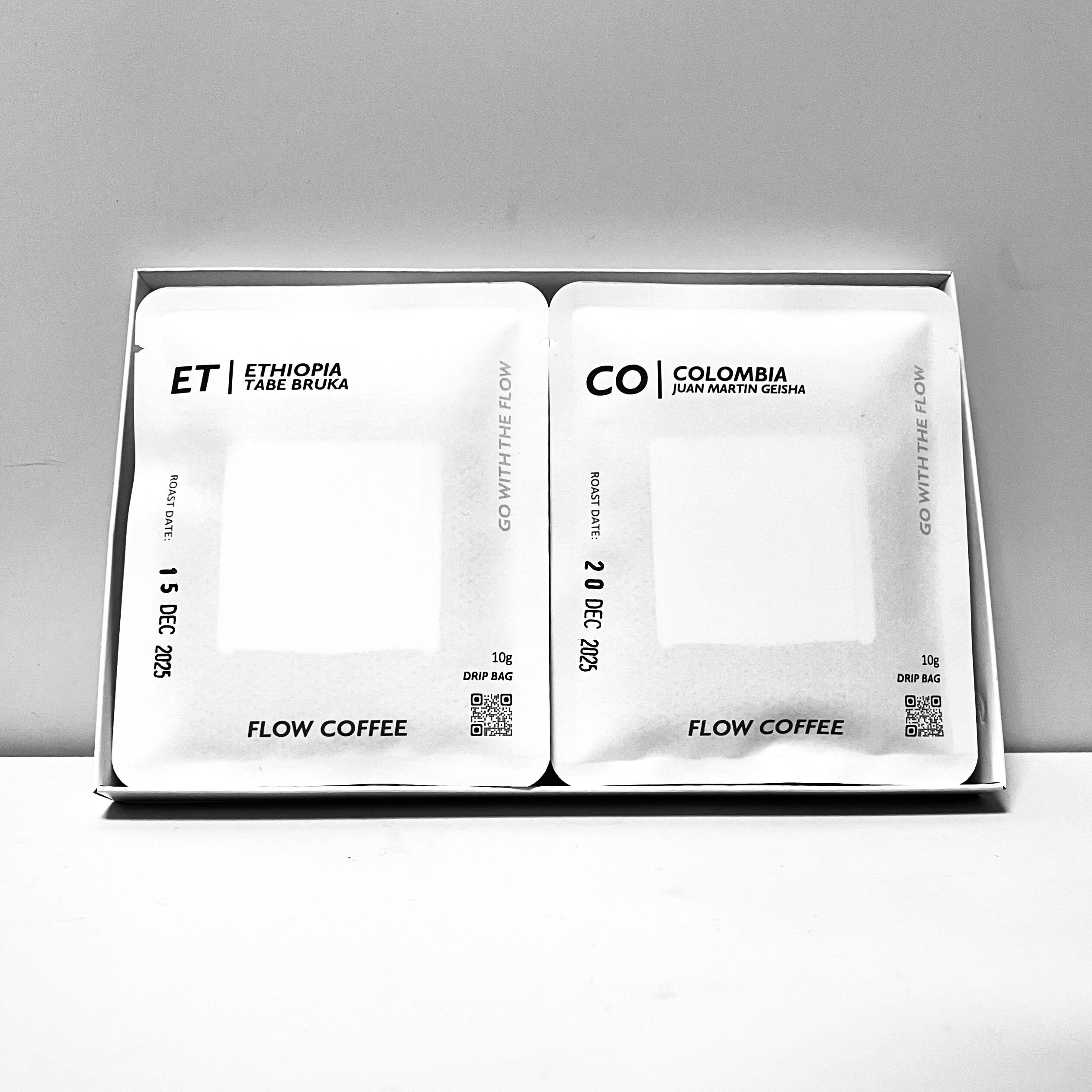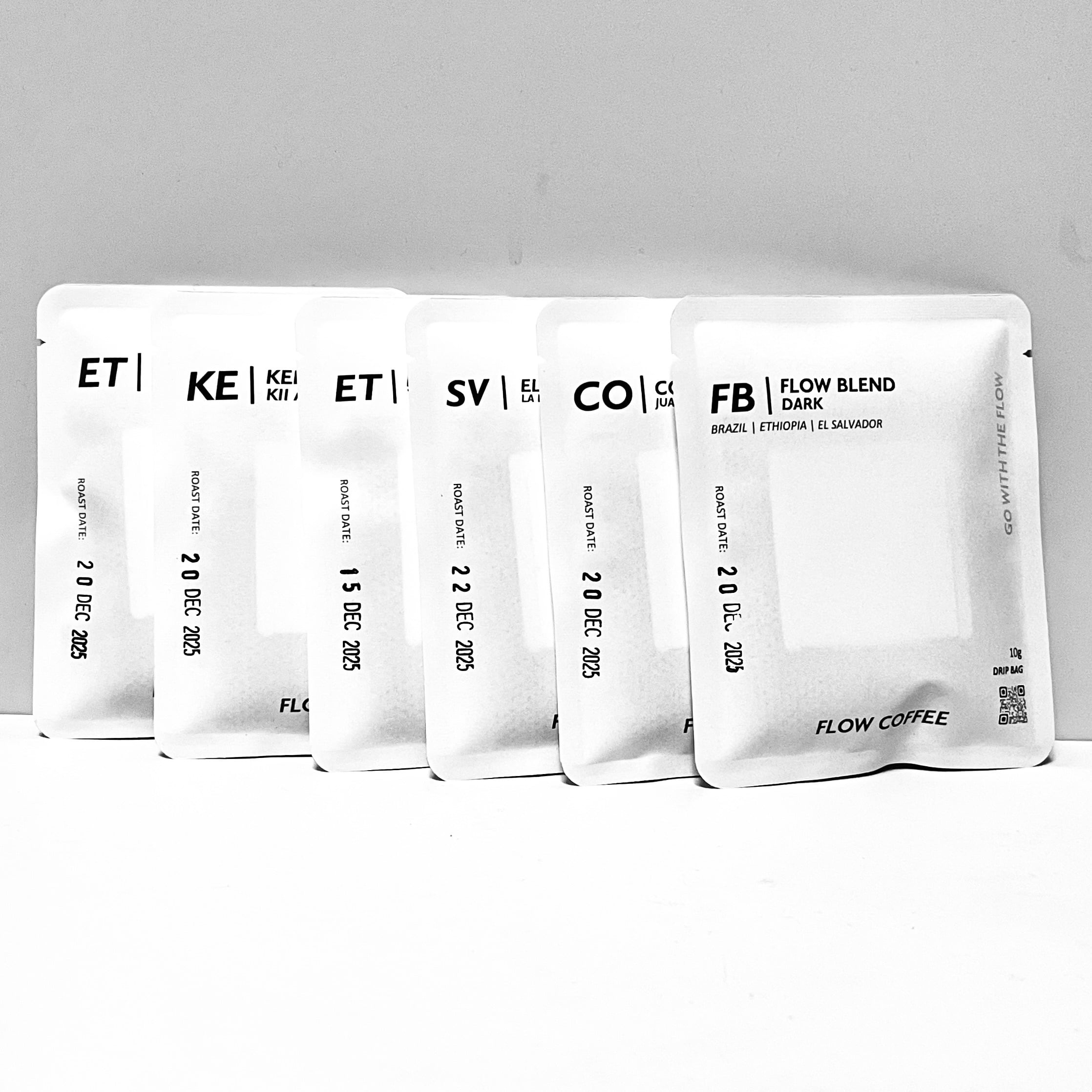 FLOW BLENDとシングルオリジンのドリップバッグ(個包装)合計6個をアソートしたものをお届けします。